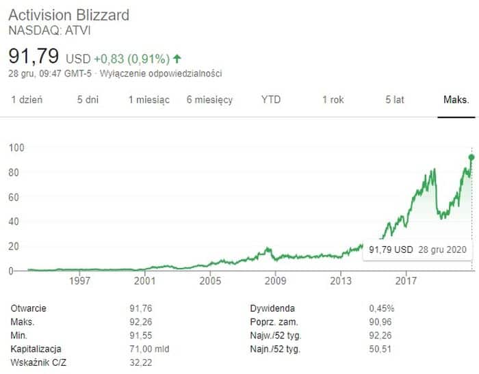 Oznacza to, że w dniu 28 grudnia wartość akcji Activision Blizzard wynosiła 91,79 dolarów. Prognozy są całkiem przyjemne. Spółka oczekuje zysku w wysokości 7,76 miliarda dolarów, a tym samym pobicia rekordu z 2018 roku. Wtedy przychód wynosił 7,5 miliarda dolarów.