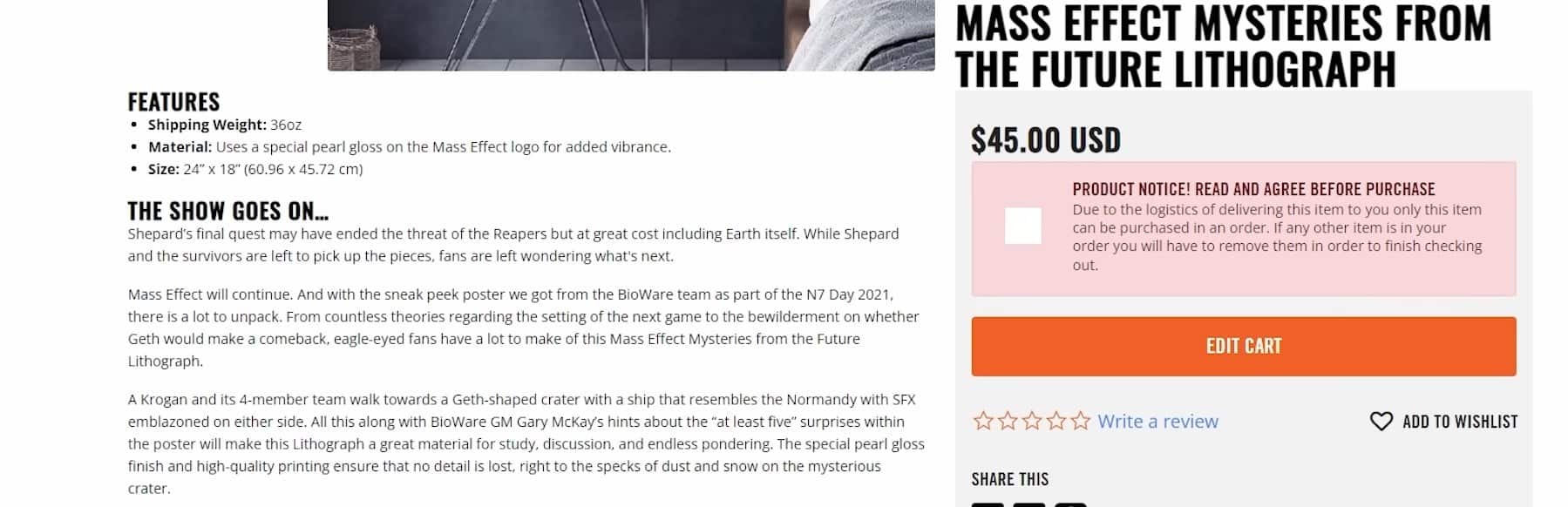 Dwa dni temu w sieci pojawił się pewien obiecujący materiał filmowy od youtubera o nicku MrHulthen. Zajmuje się on badaniem nietypowych rzeczy w grach oraz śledzi ciekawe informacje dotyczące nadchodzących produkcji. I właśnie z ostatnim rodzajem jego twórczości mamy tu do czynienia. W jego materiale New Details About Mass Effect 4 Has Been TEASED pojawia się rzut ze strony sklepu dewelopera, który posiadał bardzo interesującą infomacje o gadżecie. Niestety studio zdążyło już zmienić opis sprzedawanej litografii, ale na szczęście wciąż możemy zobaczyć, co w nim było napisane dzięki zdjęciom MrHulthena.