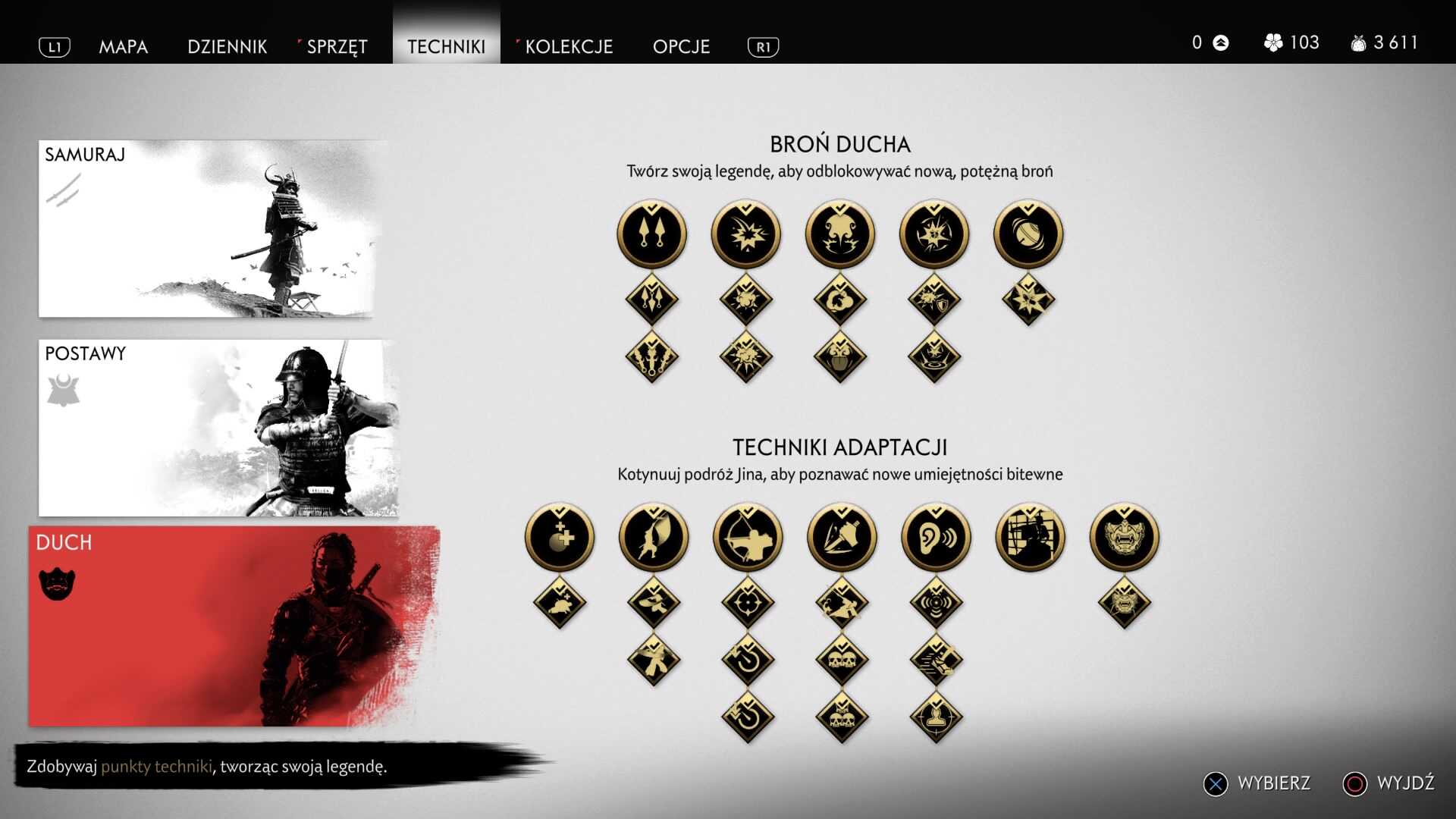 Dostępne są także zwyczajne questy typu ocal wioskę przed bandytami czy zbierz pożywienie dla głodujących uchodźców. Nie są one może aż tak ciekawe, ale dzięki przyjemnemu systemowi walki i eksploracji przez dłuższy czas ma się ochotę je wykonywać. Samo pokonywanie hasających po lasach Mongołów jest szczególnie zajmujące z uwagi na dwie ścieżki umiejętności, które możemy dowolnie rozwijać. Są to ścieżki Samuraja i Ducha. Pierwsza, jak można się domyślić, oznacza otwartą walkę, która do najłatwiejszych nie należy, zwłaszcza jeśli walczymy z całym wrogim obozem. Ciekawym urozmaiceniem współpracującym z tym stylem jest „Prowokacja”. Otóż za każdym razem, kiedy zbliżamy się do nieprzyjaznego oddziału, mamy możliwość sprowokowania go. Dzięki tej sztuce jesteśmy w stanie pozbyć się nawet do pięciu przeciwników w pierwszej minucie walki. Wystarczy do tego tylko dobre oko oraz szybki refleks. Drugą ścieżką jest działalność skrytobójcza. Mamy wtedy do dyspozycji trochę inny wachlarz umiejętności. Trzeba zaznaczyć, że drogi nie blokują siebie nawzajem, więc jeżeli mamy odpowiednią ilość punktów doświadczenia, jesteśmy w stanie odblokować wszystkie umiejętności dostępne w drzewkach. Ciekawostką jest zachowanie Mongołów: jeśli preferujemy ukrywanie się w trawie i atakowanie niczego nieświadomych ofiar, z czasem zaczną się orientować w sytuacji. Od tej pory będą starać się chodzić co najmniej we dwie osoby na patrol oraz utrzymywać ze sobą kontakt wzrokowy, żeby uniknąć śmierci z rąk Ducha. Ciekawe urozmaicenie, nieprawdaż?