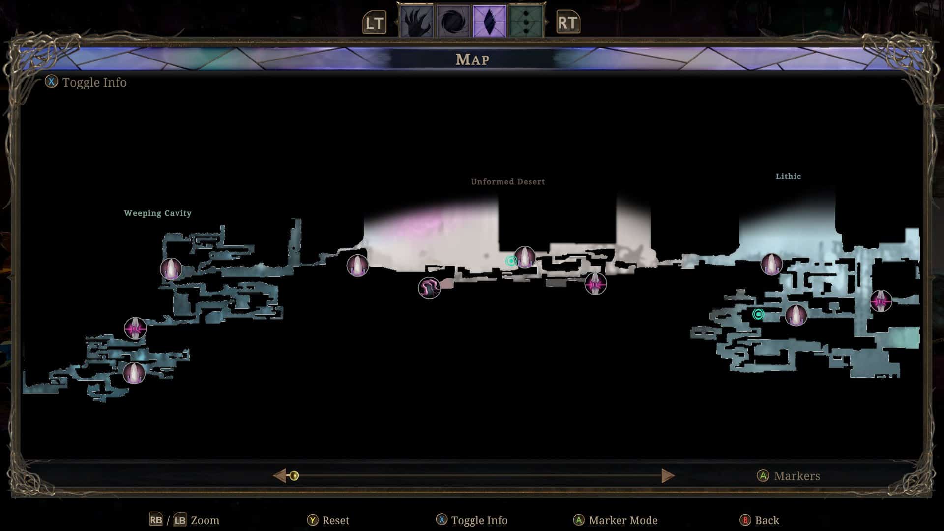 Nie ma lekko. Recenzja Grime nie może się obyć bez jakiegokolwiek opisu tego procederu. Ale po kolei. Najpierw mapa! Wydawałoby się, że początkowo krążymy w ciemności. Każdy obszar zawiera jedno miejsce, w którym dzięki aktywacji specjalnego kryształu uruchamiamy opcję zapisywania mapy i jej odsłoniętych fragmentów. Z czasem odblokowuje się także szybka podróż między lokacjami, co jak zawsze jest niezwykle przydatne – nikt nie lubi popylać piechotą z jednego końca świata gry na drugi.