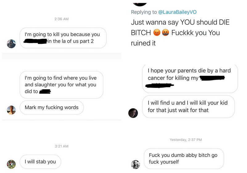 Nic dziwnego, że grę zalały fale krytyki. A nawet i więcej, bowiem do Neila Druckmanna zaczęły przychodzić pogróżki oraz bardzo niemiłe wiadomości. O ile zrozumiałe jest kierowanie pretensji do niego jako ojca serii, który w największym stopniu odpowiada za scenariusz i decyzje z nim związane (podkreślamy jednak, że wszelkie groźby są karygodne i nigdy nie powinno do takich sytuacji dochodzić), to całkowitym brakiem szacunku i ogłady są wiadomości z groźbami śmierci do Laury Bailey – aktorki użyczającej wizerunku i głosu Abby, niemającej wpływu na wydarzenia w grze.