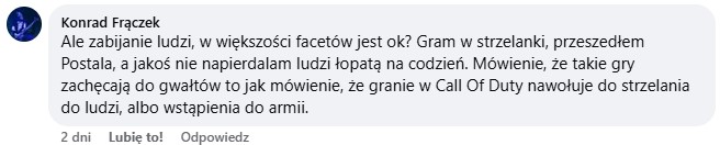 W komentarzach do fejsbukowego wpisu pojawiają się również głosy pełne lekceważenia, które śmieją się z oburzenia innych. Oczywiście, takie reakcje są wynikiem ignorancji, nie tylko na temat samej gry, ale także jej potencjalnych skutków społecznych. Sugerowanie, że osoby protestujące przeciwko grze są po prostu „przewrażliwione” i powinny się zająć czymś innym, jest wyrazem tego, jak niektórzy internauci lekceważą powagę sytuacji. To podejście sprawia, że zamiast konstruktywnej debaty nad tym, jakie gry i treści powinny mieć miejsce w publicznych przestrzeniach, mamy do czynienia z błahym wyśmiewaniem osób, które mają odwagę stawiać moralne pytania. W takim kontekście wolność twórcza staje się niczym więcej jak pustym sloganem. Za nim zaś kryje się brak refleksji na temat odpowiedzialności twórców.