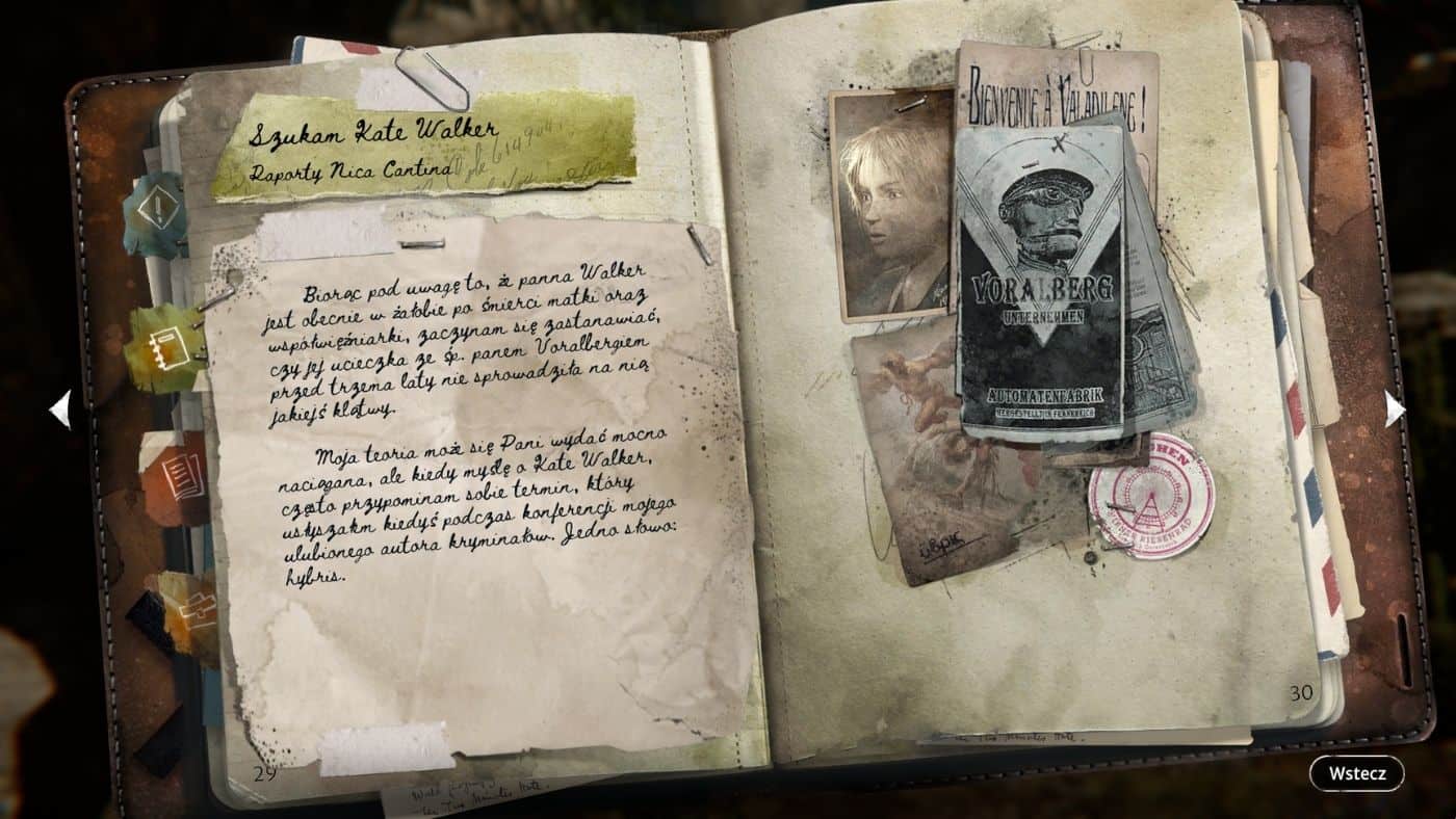 W rzeczywistości z 2004 i 2005 roku Kate Walker z przeżywa poniekąd coś podobnego. Za nią gonią jednak wyrzuty sumienia… oraz detektyw wysłany jej tropem z ramienia przyjaciółki z Nowego Jorku, Oliwii. Poczynania i postępy w śledztwie, a także poniekąd podsumowanie tego, co sami do tej pory odkryliśmy, będziemy znajdować na bieżąco w jego dzienniku. Z jednej strony takie rozwiązanie zapisu postępów było ciekawym rozwiązaniem. Nie otrzymaliśmy bowiem pamiętnika żadnej z głównych bohaterek, co jest chyba najpowszechniejszym rozwiązaniem zapisu historii w wielu innych grach. Z drugiej jednak przyznaję, że trochę mnie dziwiło, z jaką łatwością ludzie, których spotykaliśmy po drodze, udzielali wspomnianemu detektywowi wszelkich informacji na temat postępów Kate. Zdaję sobie sprawę, że była prawniczka raczej nie informowała NPC-ów, że w USA jest uznana za kryminalistkę. Niemniej gdybym to ja była na miejscu jednej z tych postaci pobocznych, to raczej czułabym się mocno zaniepokojona przez podobne wypytywanie o kogoś znajomego.