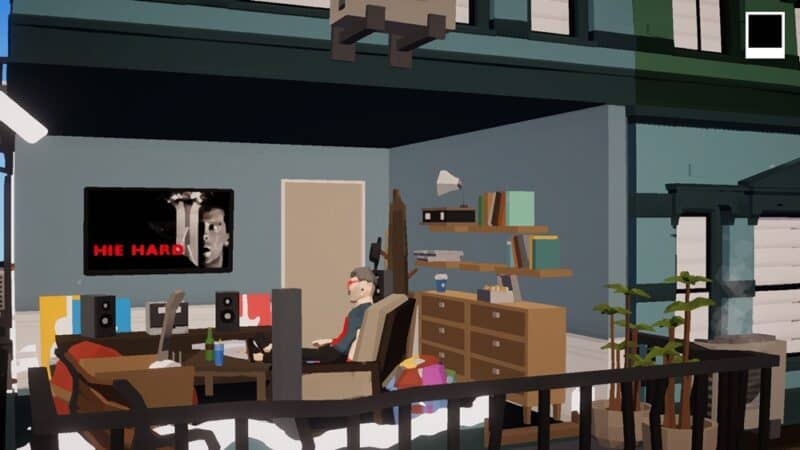 Atmosfera produkcji jest naprawdę przyjemna. W tle grają gitarki, chociaż niestety się zapętlają i w pewnym momencie idzie oszaleć, gdy po raz kolejny słyszymy tę samą nutę. Ale pierwsze pół godziny jest jak najbardziej pozytywne. Do tego ten cały świat jest prześliczny, przynajmniej według mnie, a to moja recenzja Love – A Puzzle Box Filled with Stories. Część teraźniejsza budynku jest kolorowa, jasna, a część w przeszłości czarno-biała i taka tajemnicza. Bohaterowie, których wspomnienia oglądamy, są oznaczeni czerwonymi elementami odzieży, na przykład krawatem czy czapką. Nie ma tu prawie w ogóle szczegółów, wszystkie modele są grubo ciosane, ale to nie oznacza, że nie wyglądają dobrze. Wręcz przeciwnie – design budynku i jego mieszkańców jest naprawdę pierwszorzędny i przejrzysty.