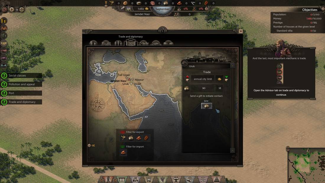 Jeśli zaś chodzi o rozwój miasta, to mogę opisać go w czterech słowach: bez handlu jest znikomy. I nie ma w tym nic dziwnego, w końcu bez sprzedaży wytwarzanych dóbr nie mielibyśmy pieniędzy na pensje i rozbudowę miejską. Jednakże system, na którym ten handel się opiera, jest kolejnym irytującym elementem w tej grze. Aby nawiązać relacje handlowe z innymi miastami, musimy najpierw zdobyć ich zaufanie i sympatię. W tym celu należy wysłać im odpowiedni podarunek lub/oraz zdobyć odpowiednio wysoki wskaźnik prestiżu. Gdy już nam się to uda, możemy się spodziewać, że co jakiś czas każde z tych partnerskich miast poprosi o przesłanie konkretnej ilości jednego z towarów. Nie dość, że w pewnym momencie prośby te przybierają na częstotliwości, to także często przyczyniają się do tego, że przez ofiarowanie danych materiałów innemu miastu nie starcza go dla naszych obywateli.