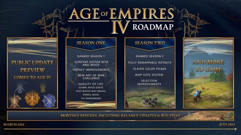 Pierwszy sezon, który oferuje roadmapa Age of Empires 4 na pierwszą połowę 2022 roku oferuje jeszcze ogólną poprawę płynności tytułu. Natomiast sezon drugi zmieni całkowicie ułożenie przycisków szybkiego wywoływania. Poza tym studio chce postawić na jeszcze większą elastyczność samej gry. Jak podkreślają twórcy zależy im bardzo na tym, żeby każdy znalazł w ich produkcji coś dla siebie. Poza tym pojawi się ranking map i możliwość zmiany koloru gracza.