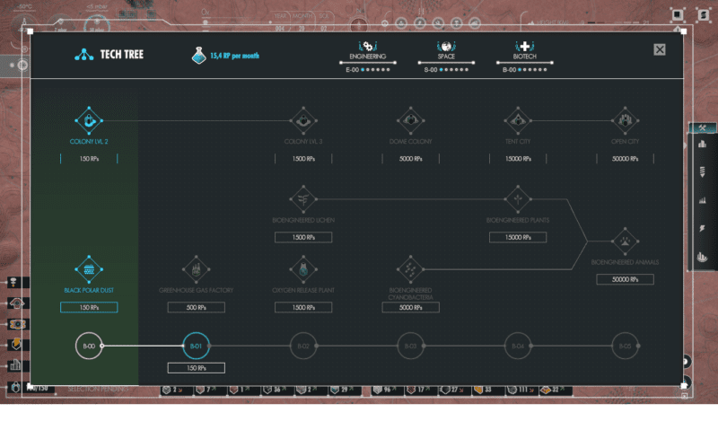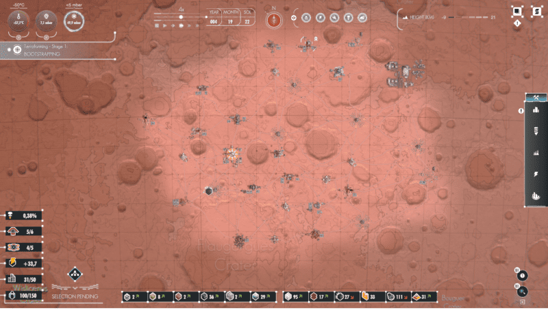 Warto jednak zatrzymać się w tym miejscu, aby wspomnieć o największej zalecie Per Aspera, jaką jest oprawa graficzna. Mapa pełna jest szczegółów odwzorowujących rzeczywistą powierzchnię Marsa, łącznie z nazwami kraterów. Początkowo zachowawczo i tak sprawdzałam je w Internecie – nie udało mi się jednak złapać twórców na żadnym zmyślnym akcie kreatywności. Odpowiednie ustawienie kamery pozwala nam przeanalizować budowę praktycznie całej planety, choć w początkowym etapie gry znaczna część obszarów pozostaje zakryta. Samo odkrywanie jest zresztą procesem niezwykle fascynującym – tak jak i obserwowanie zmian, które zachodzą w przestrzeni dzięki podjętym przez nas decyzjom