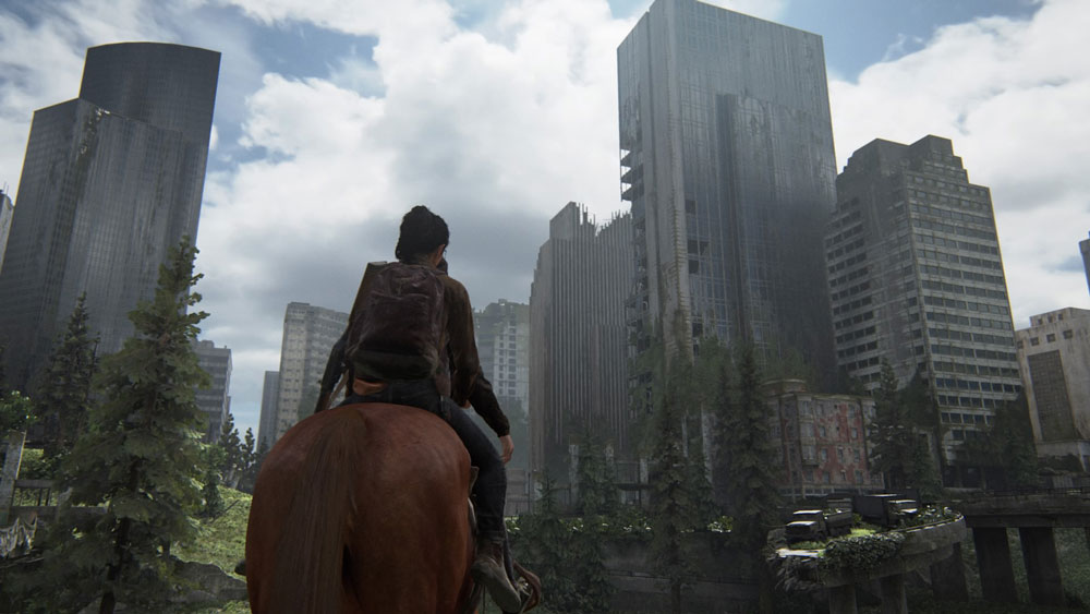 Omawiając The Last of Us: Part II, nie sposób nie wspomnieć o wykreowanym świecie. Od wybuchu epidemii minęło dwadzieścia pięć lat, w ciągu których świat zmienił się nieodwracalnie. Podróżując, możemy zobaczyć między innymi tętniące życiem małe miasteczka oraz dużą metropolię zniszczoną przez bombardowanie, a naprawianą przez naturę, z którą obcujemy przez większość rozgrywki. Budynki zajęte są przez rośliny i zarażonych, a końce ulic płynnie przechodzą w tereny leśne. Same mapy są pełne różnych skarbów, które ciężko znaleźć za pierwszym podejściem, dlatego dobrym pomysłem jest mapa do półotwartego terenu, którą znajdujemy na początku gry. Ellie zaznacza na niej miejsca godne uwagi oraz skreśla te odwiedzone. Do dyspozycji ma ona także osobisty dziennik, gdzie szkicuje ciekawsze obiekty i zapisuje swoje przemyślenia. Oczywiście można od razu iść do celu, ponieważ gra nie zmusza nas do eksploracji, ale bądźmy szczerzy – w przypadku historii takich jak ta ciężko na ślepo przeć przed siebie, nie zaglądając w każdy kąt.