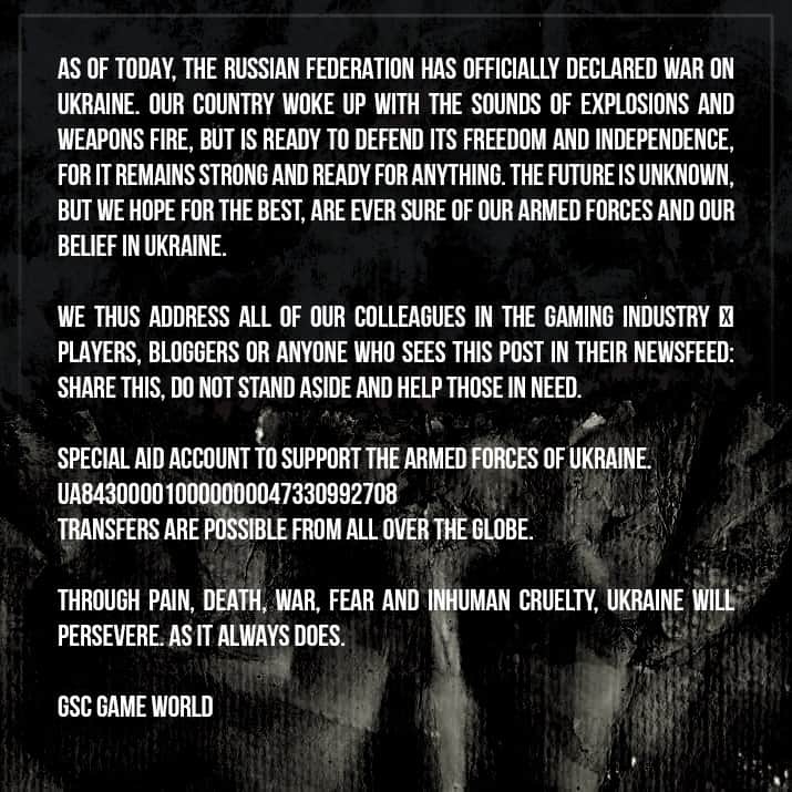 GSC Game World zaś, czyli twórcy Stalkera, podali numer konta, na który można przelewać środki, aby wesprzeć siły zbrojne Ukrainy. Napisali: