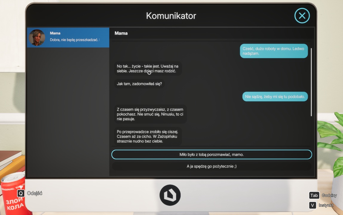 Kolejnego ranka zastanawiam się, czy nie trzeba mu jednak kupić węgla lub stoperanu, skoro po całym domu porozrzucał kolejnych pięć par brudnych gaci. I przy okazji dezodorant do stóp, skoro zużył w tym czasie osiem skarpetek. Kolejne pranie, kolejne mycie podłóg, naczynia… Chciałem zrobić zakupy online, skoro już miałem te 1000 dolarów niby. W sieci jednak można kupić jedynie mop, kapsułki do prania, wilgotną gąbkę (sic!) i to w cenie za 300 dolarów w górę. Ponownie – rozmowa z matką i znowu rozliczenie ze strony męża. Na tym demo się kończy.
