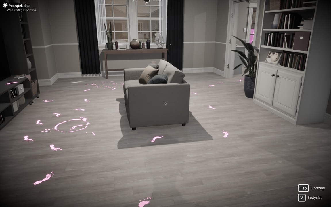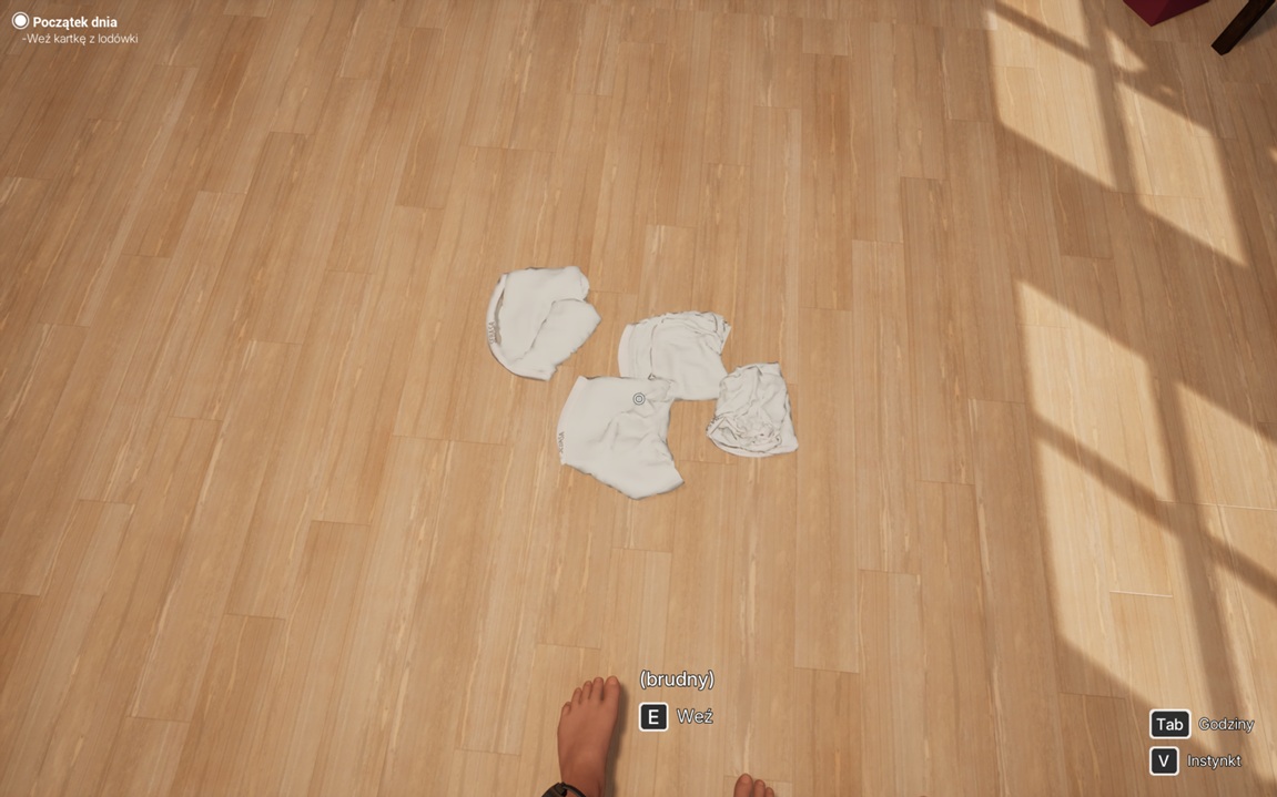 Włączam grę. Już w menu zaskoczyło mnie to, że demo ma polską wersję, ale szybko się okazuje, że do tłumaczenia najpewniej zaprzęgnięto AI. Ale ok, odpalam! Wchodzę w życie Niny, po wygłupach przed lustrem domyślam się, że kobiety w wieku około trzydziestki. Pierwsze co widzę, to porozrzucaną wszędzie bieliznę i myślę „ależ ten małżonek roztrzepany. Tak wszędzie zostawić pięć par majtek i trzy skarpety… i wszystkie brudne!” (a dzieci przecież nie mamy).