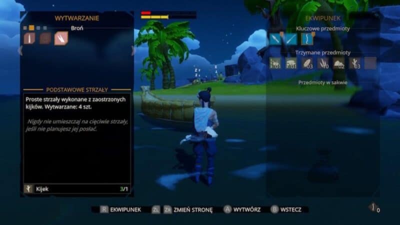 Skoro mowa o materiałach, gra ma naprawdę ładnie rozbudowany crafting. Na start jedyną dostępną opcją jest wytworzenie zaostrzonego kijka. Jednak w miarę odkrywania kolejnych surowców w menu pojawiają się nowe przedmioty do stworzenia. Trzeba dodać, że części materiałów nie można zdobyć, dopóki nie stworzymy potrzebnego narzędzia. I tu twórcy zaliczają u mnie minusa. Do niektórych potrzebna jest kość konkretnego stworzenia. Problem w tym, że trudno je napotkać (a i zabić niełatwo), przez co na jedno z nich natknęłam się dopiero w ostatnim rozdziale. I to nie jest niestety jedyna wada craftingu, gdyż rozgrywkę uprzykrza także bezużyteczność bardziej zaawansowanych recept. Grę spokojnie można przejść, mając łuk przodków i łódź z trawy.