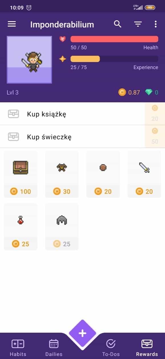 Avatar zwiększa swoje doświadczenie za każdym razem, kiedy wykonamy zadanie lub zrobimy kolejny krok do wyrobienia w sobie nawyku. Jednak jeśli nie wykonamy zadania z poprzedniego dnia albo ulegniemy złym przyzwyczajeniom, traci on zdrowie. Można je odzyskać, przechodząc na następny poziom lub kupując za monety specjalny eliksir. Pieniądze zarabiamy wraz z punktami doświadczenia i możemy je później wydać w zakładce Rewards, np. na ekwipunek dla naszej postaci. Ciekawą opcją jest też dodawanie własnych nagród, które możemy wykupić po zebraniu odpowiedniej ilości monet. W ten sposób nagradzamy nie tylko naszego awatara, ale też siebie.